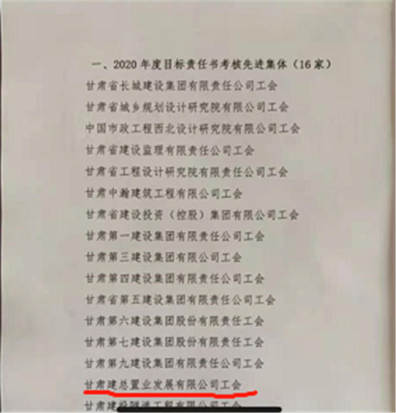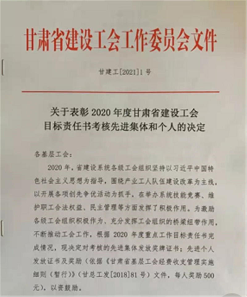 近日,置業(yè)公司工會在甘肅省建設(shè)工會委員組織的2020年度甘肅省建設(shè)工會目標責任書考核中評為“2020年度目標責任書考核先進集體”。