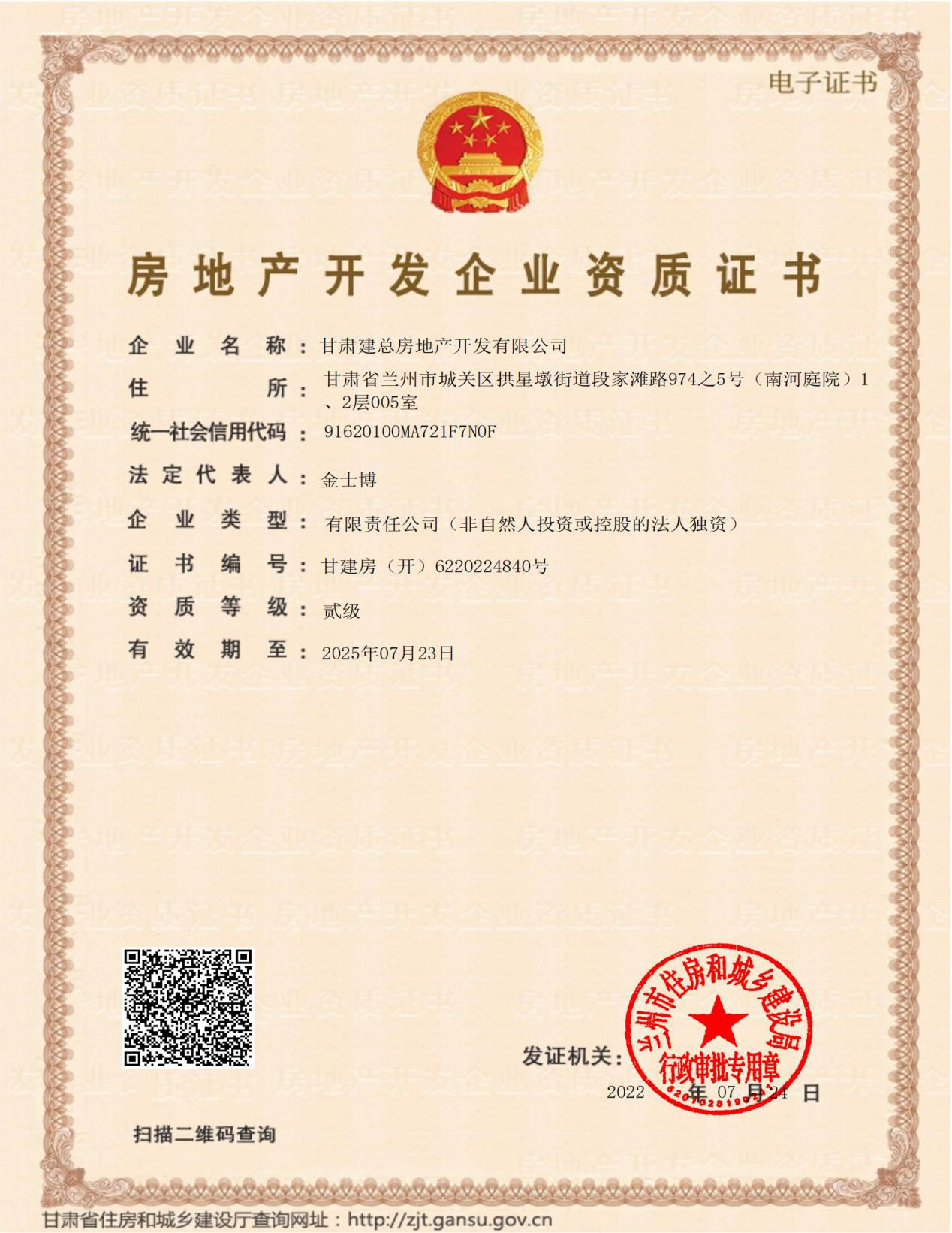 7月23日,蘭州分公司取得甘肅建總房地產(chǎn)開發(fā)有限公司房地產(chǎn)開發(fā)企業(yè)資質(zhì)貳級(jí)證書。