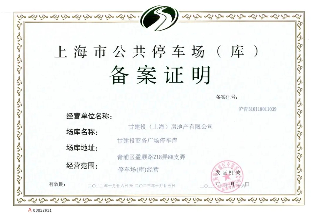 近期,上海子公司正式取得《上海市公共停車(chē)場(chǎng)(庫(kù))備案證明》,甘建投商務(wù)廣場(chǎng)停車(chē)場(chǎng)(庫(kù))可正常對(duì)外收費(fèi)經(jīng)營(yíng)。