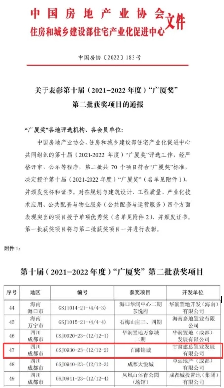 近日,由甘肅建總置業(yè)發(fā)展有限公司成都公司開發(fā)建設(shè)的百酈錦城項(xiàng)目榮獲中國房地產(chǎn)業(yè)最高榮譽(yù)“廣廈獎(jiǎng)”。