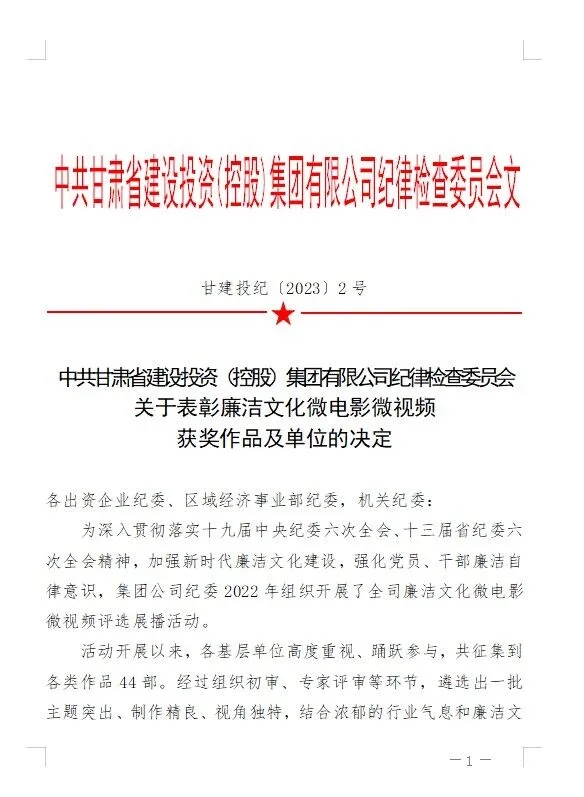 1月19日,在集團公司紀(jì)委2022年開展的全司廉潔文化微電影微視頻評選展播活動中,公司紀(jì)委榮獲“甘肅建投廉潔文化微電影微視頻三等獎”榮譽稱號。