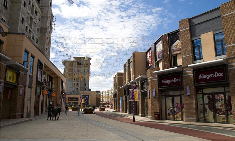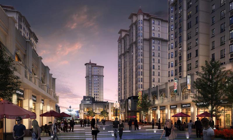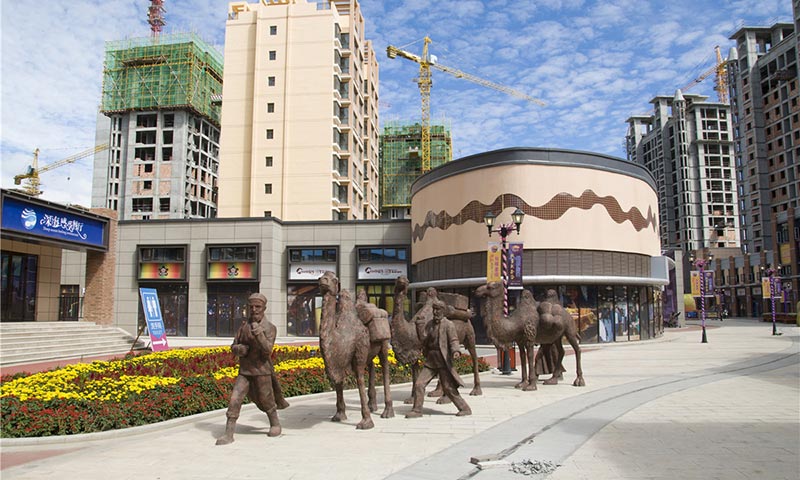 重點打造的絲路金街,由整個項目的主軸線-----商業(yè)步行街及500米帶狀公園組成。整體設(shè)計中突出強烈的絲路元素,以“流動的彩綢”為設(shè)計靈感,將13000公里長的古絲綢之路全程按1:15000的比例進行了完美濃縮,以沿途最重要城市為節(jié)點打造的五大主題雕塑群將整條金街完美相連。